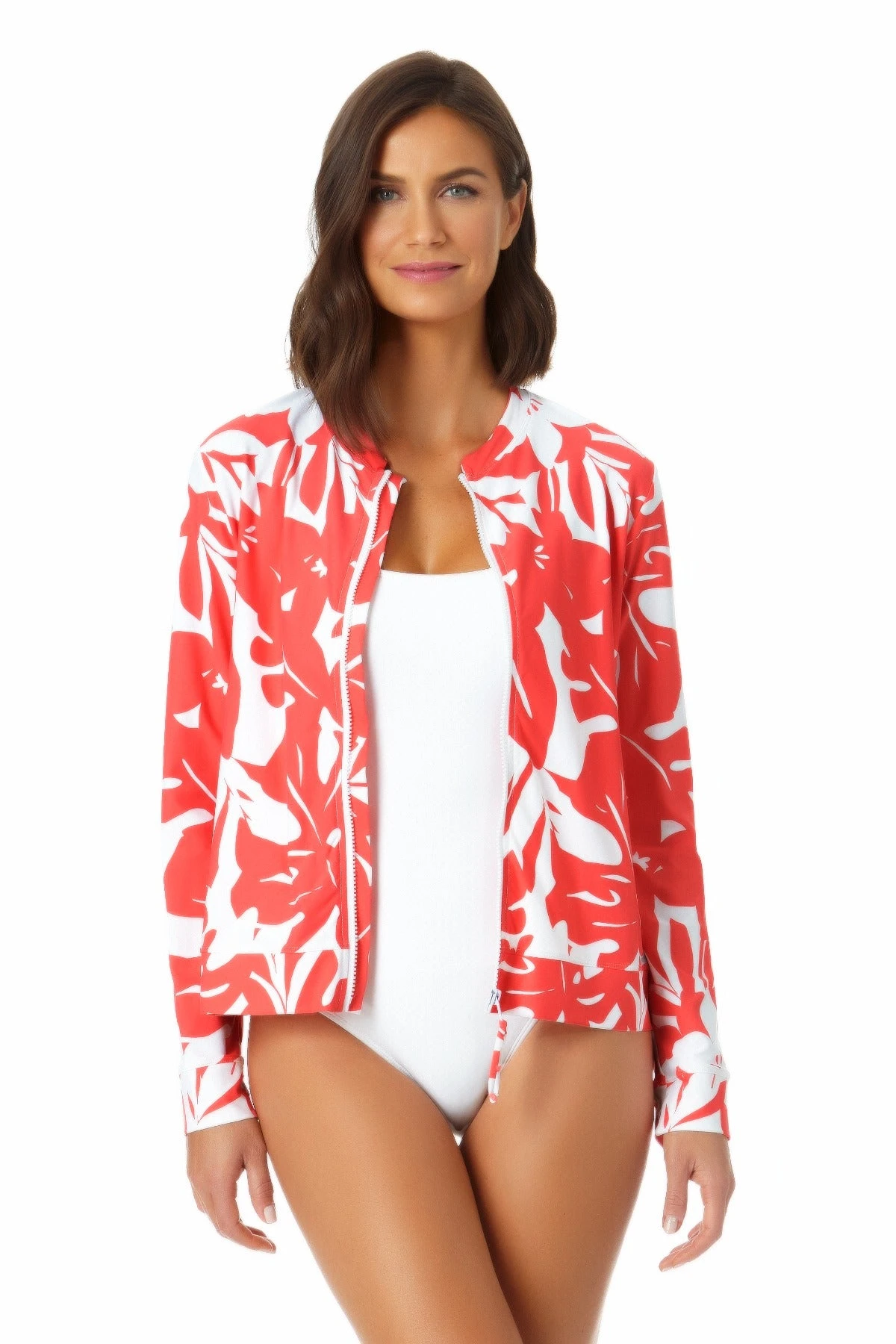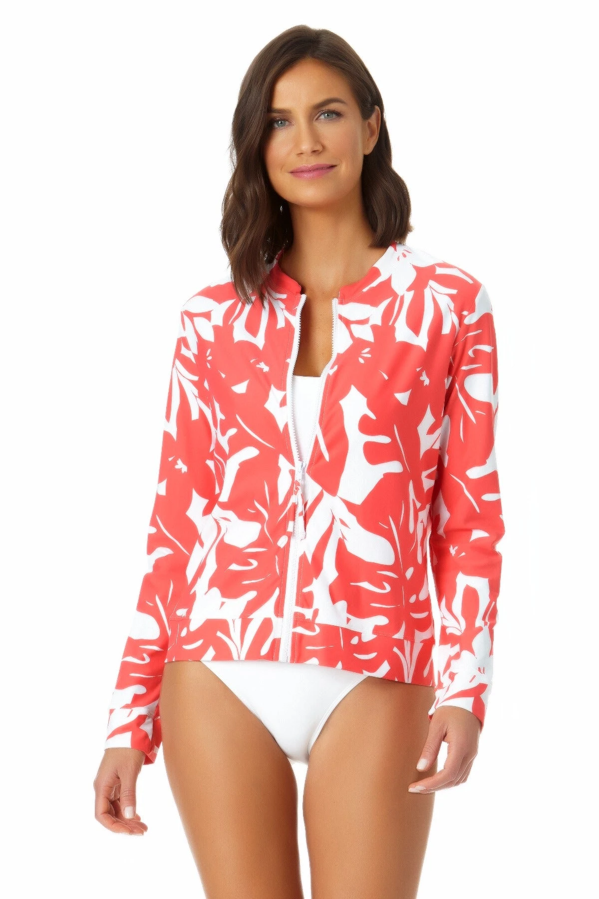 Stay safe from harmful UV rays with our Long Sleeve Front Zip Rash Guard. This bright and tropical rash guard is perfect to wear as a cover up over your bikini while keeping the sun off your skin during those hot summer days. Long sleeves will protect your arms from the sun as you enjoy the water. This rash guard’s UPF 50+ sun protection makes this suit not only stylish but functional for all your activities, whether in or out of the water.