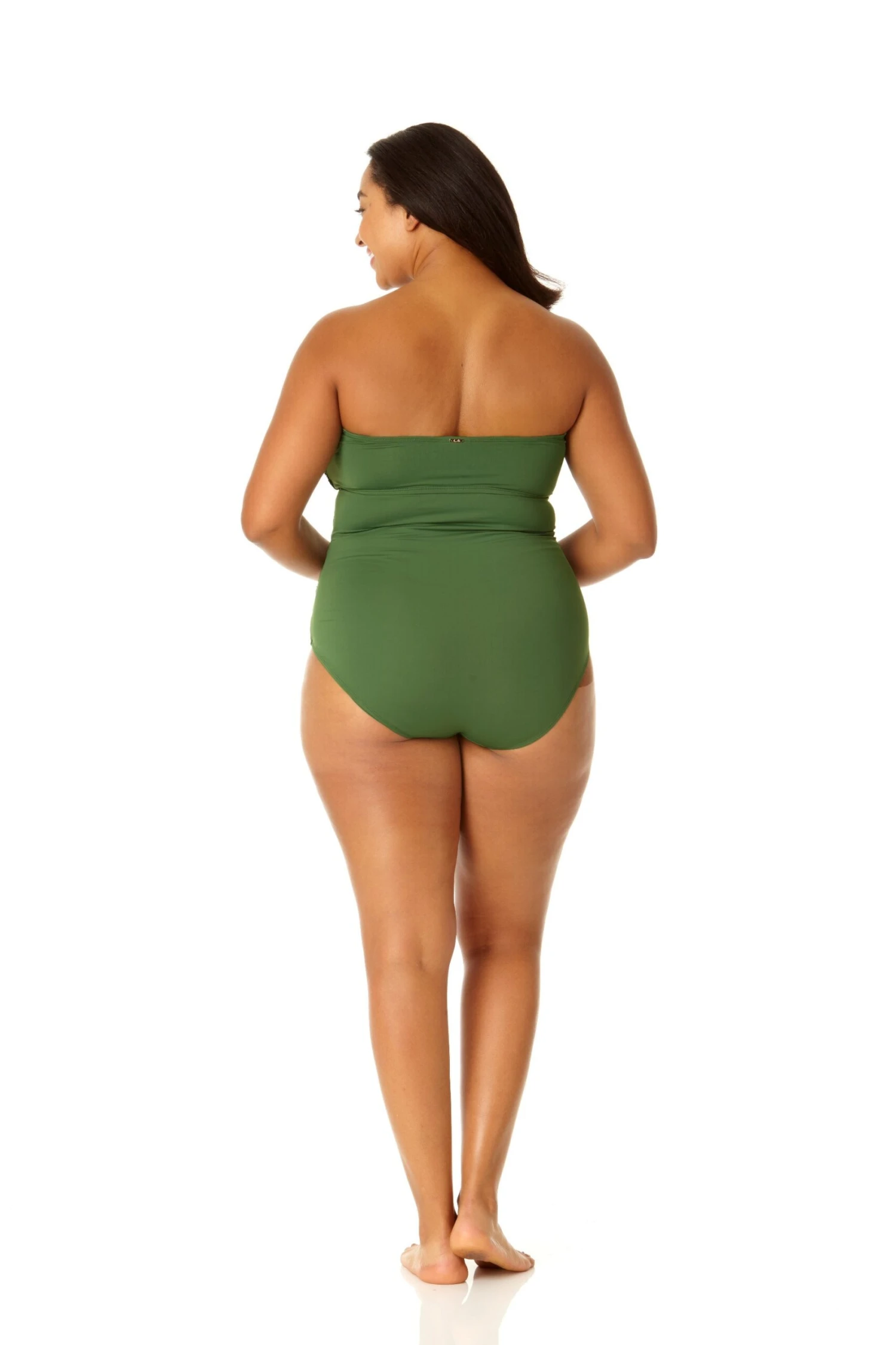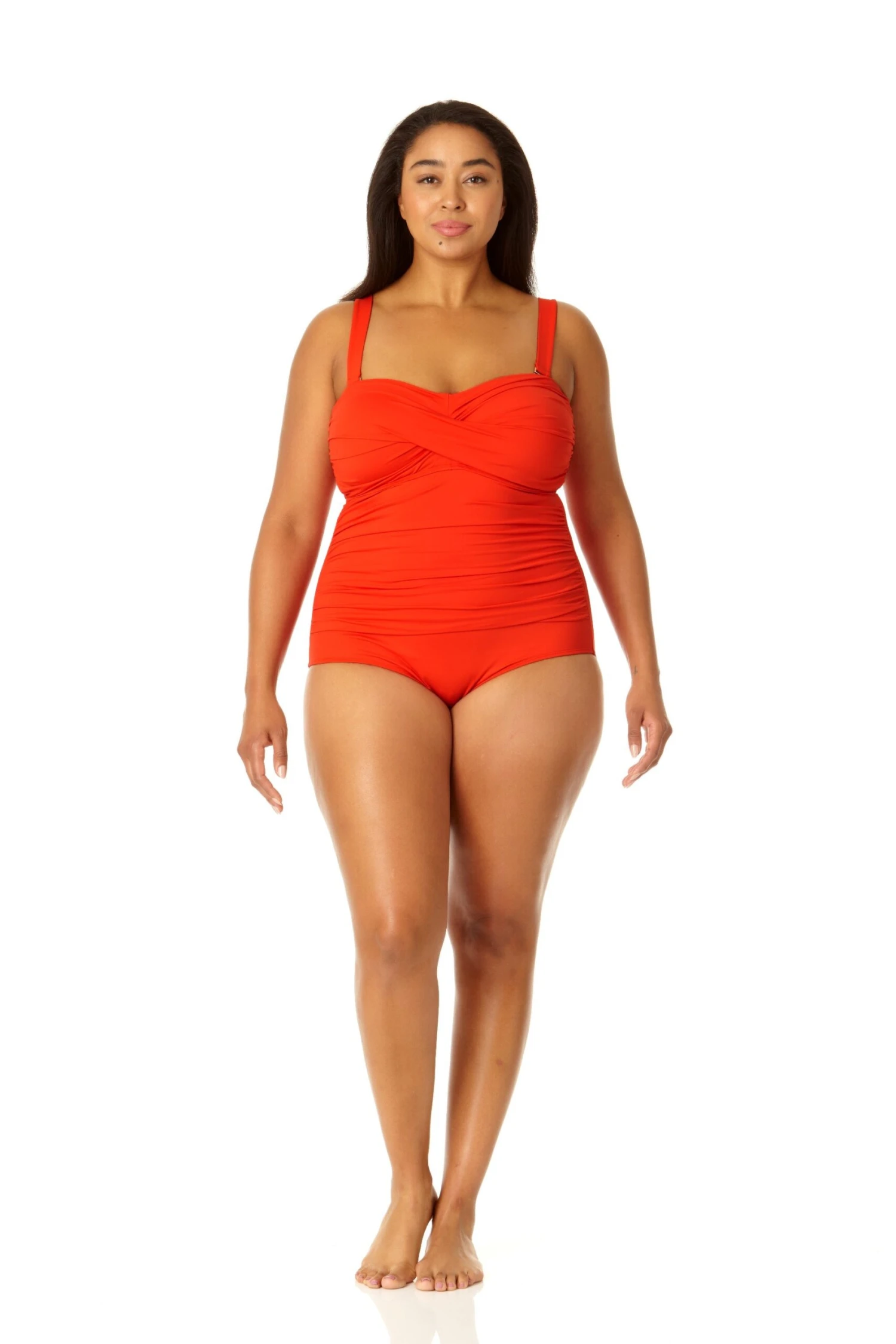 Whether you prefer to swim in the ocean or at a pool, you’ll love our twist front shirred one piece swimsuit This one piece swimsuit features adjustable and removable over-the-shoulder straps to ensure a perfect fit while giving you different ways to style your look. Shirred details and a twist front on this bandeau-style cut give you a figure-flattering look. Pair this twist front shirred one piece with our cover up for casual beach style.