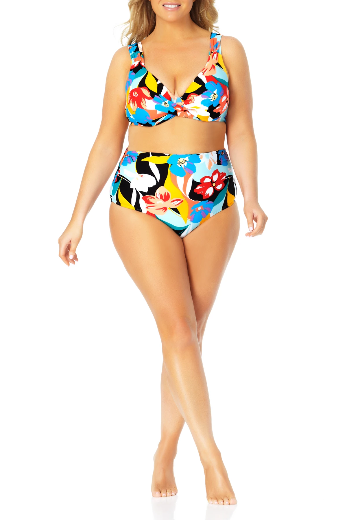 Dive into the summer with a beautiful bikini top that is as vibrant as tropical flowers. Our twist front underwire bikini top features our colorful Modern Bloom print and an elegant twist front detail to add a stylish touch. The bikini top is designed with underwire to provide comfortable support and adjustable over-the-shoulder straps for a perfect fit. Pair this eye-catching bikini top with our matching convertible shirred hi-low bikini bottom for a complete summer look!