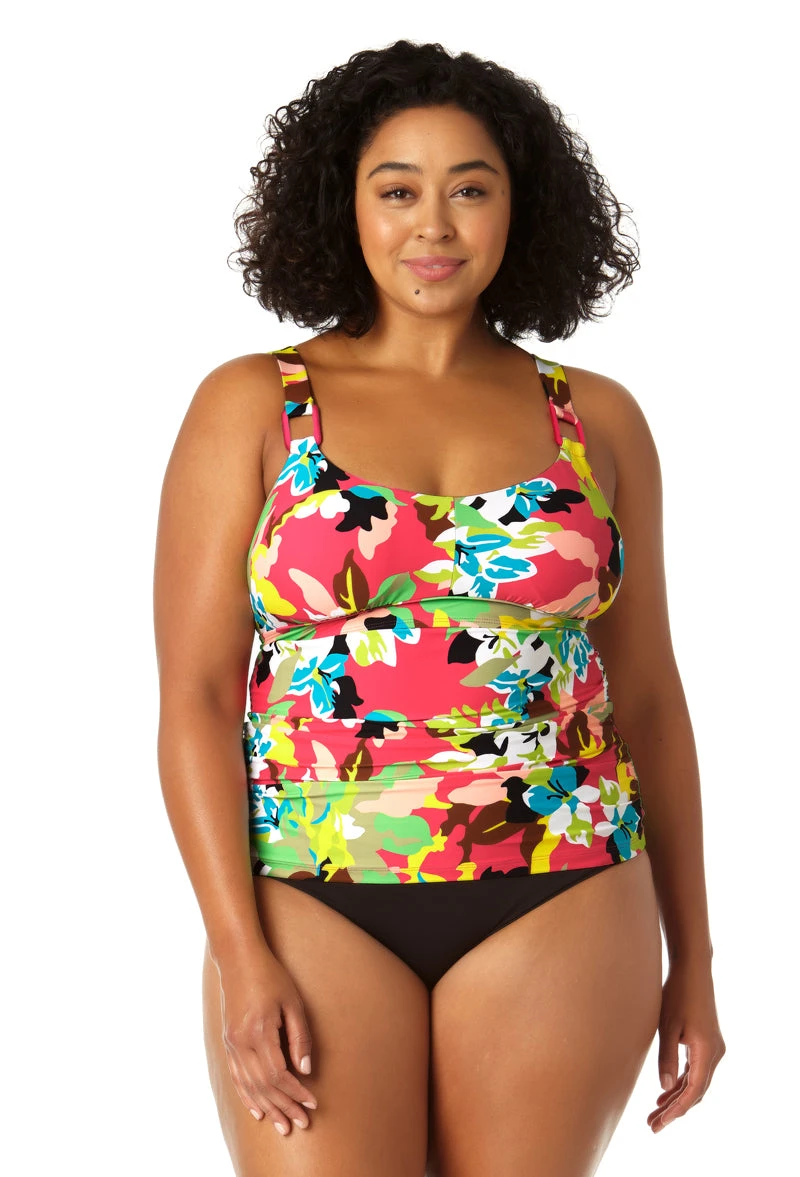 Add fresh style to your swimwear this season with our plus size Easy Ring Tri Tankini Swim Top. This bright floral tankini top is designed with a triangle silhouette to show off your shoulders and neckline, while adjustable, over-the-shoulder straps and removable cups provide customizable support and coverage. This vibrant tankini also features a unique ring detail in its straps while providing moderate coverage. Pair this plus size floral tankini with our Drape Front Mid Rise Swim Skirt Bottom for a complete look!